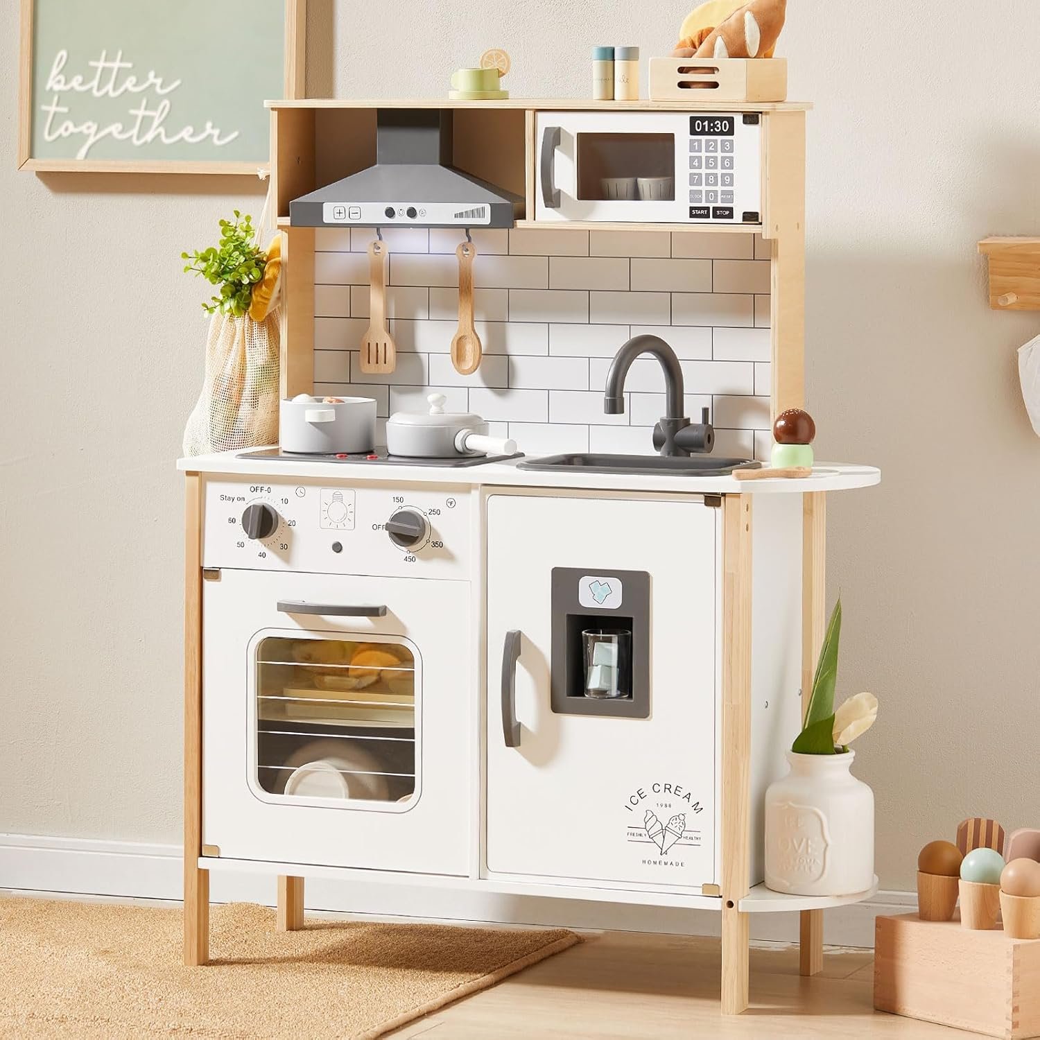 Inspire little chefs with this eco-friendly wooden play kitchen, made from non-toxic, BPA-free materials. Compact and stylish at 31″ wide, it fits beautifully in any playroom or nursery. Includes cutting food, toy kitchen utensils, a chef hat, and apron—everything kids need to start cooking right away. Packed with interactive features like a light-up stove and range hood with sound, plus a playable oven, fridge, microwave, sink, and faucet, it offers endless imaginative fun. A perfect birthday or Christmas gift for budding little chefs!