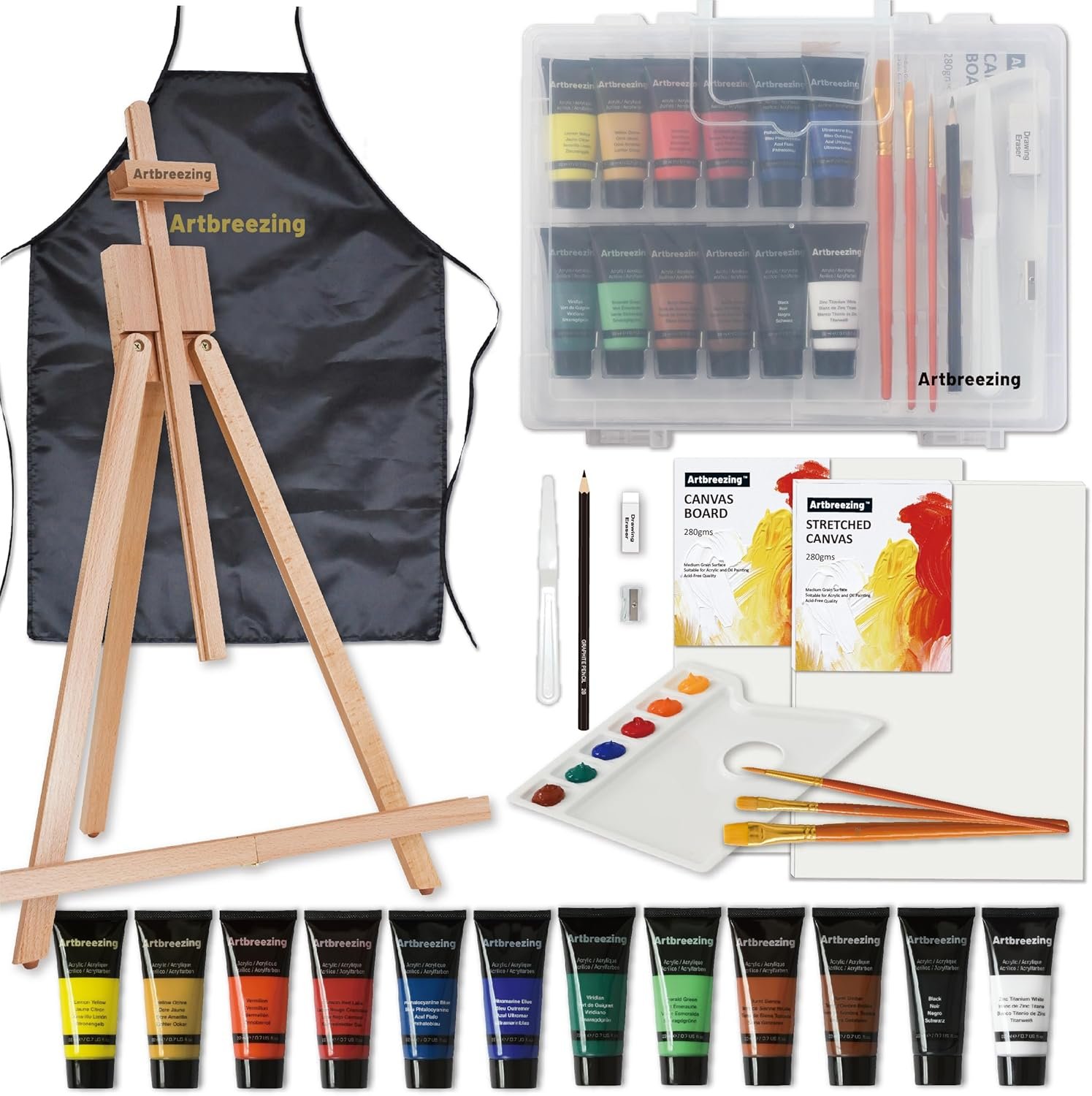 Artbreezing 25 Pieces Acrylic Painting Set with Paint, Table Easel, Brushes and Canvas
