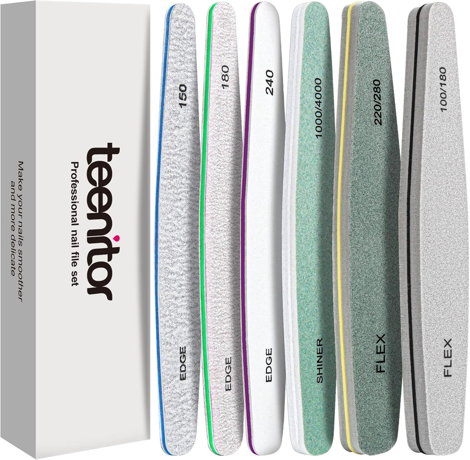 The Teenitor 6-Piece Professional Nail File and Buffer Set delivers a salon-quality manicure at home, featuring 9 grits for shaping, smoothing, and shining nails to perfection. With 150/180/240 files ideal for acrylic, gel, or natural nails, and buffer blocks up to 4000 grit, you can easily trim, smooth ridges, and polish to a glossy finish that lasts. Durable, precise, and easy to use, this multi-step nail care kit ensures flawless nails from start to shine.