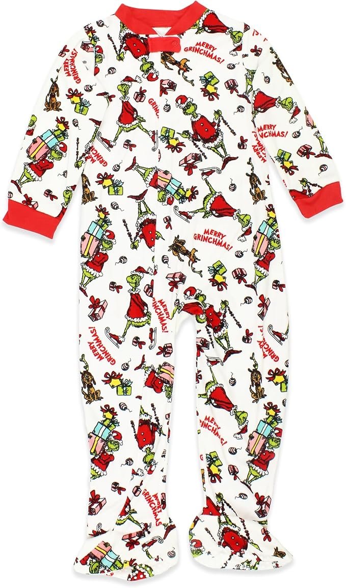 Keep little ones cozy and festive with these soft velour Grinch pajamas, made from high-quality 100% polyesterthat’s lightweight, flame-resistant, and gentle on skin. Featuring fun holiday graphics of Dr. Seuss’s The Grinch, these adorable sleepers are perfect for holiday mornings, bedtime snuggles, or Christmas photos. Designed with ribbed cuffs, double-stitched hems, and gripper feet for comfort and safety, they’re available in infant and toddler sizes for a perfect fit all season long.