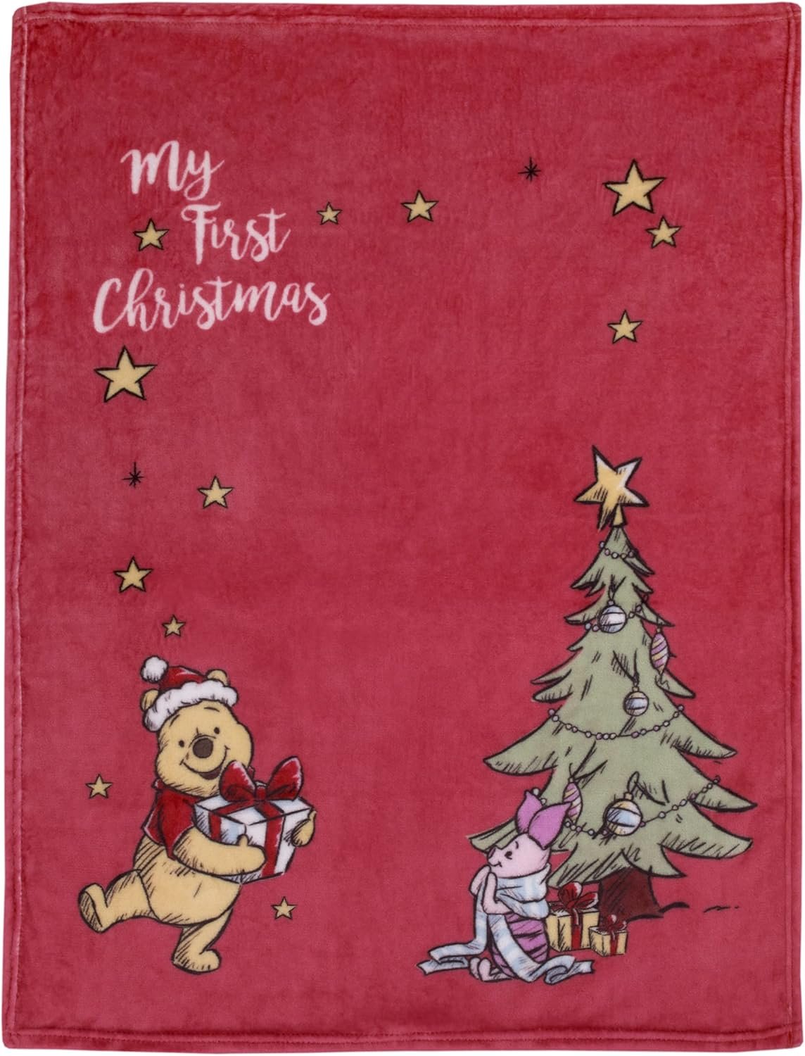 Celebrate your little one’s first holiday season with this adorable baby blanket featuring Winnie the Pooh and Pigletunder the Christmas tree, with the sweet words “My First Christmas!” Designed in festive shades of bright red, gold, and green, it makes the perfect photo opportunity to capture holiday memories. Crafted from super soft plush fabric, it’s cozy and gentle on baby’s skin — ideal for snuggling, stroller rides, or holiday outings. Measuring 30″ x 40″, it’s the perfect size for cuddling and adds a touch of Disney magic to your baby’s first Christmas.