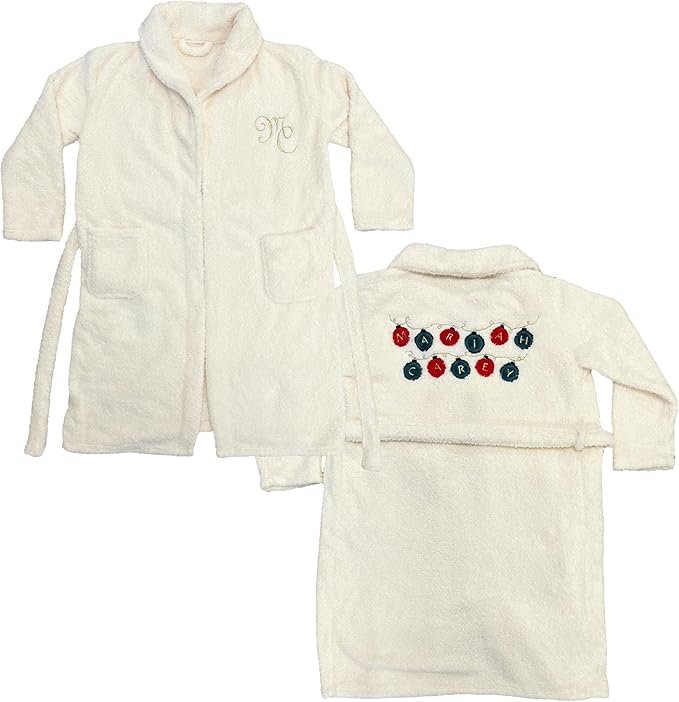 The Mariah Carey Christmastime Bathrobe wraps the season in pure comfort and festive elegance. This off-white, plush polyester robe features the iconic MC initials embroidered on the left chest and a beautifully stitched Mariah Carey ornament motif across the upper back for a touch of holiday glamour. Designed with a soft, cozy feel, it includes a matching waist belt and two hip pockets for easy lounging and relaxed winter mornings. Sold online only and officially part of the Christmas Time by Mariah Carey collection, it makes a dreamy holiday gift for fans who love to unwind in style.