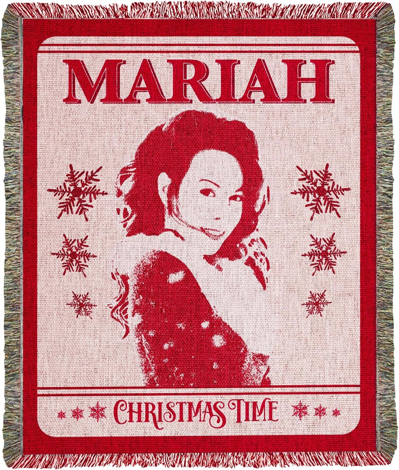 The Mariah Carey Christmastime Woven Throw Blanket is an Amazon Exclusive designed to bring cozy holiday charm to your home. Made from 100% cotton, it features a beautifully woven portrait of Mariah at the center, framed by festive “Mariah” and “Christmas Time” lettering for a classic seasonal touch. The plain woven back keeps the look clean and timeless, while fringe detailing along all four edges adds a soft, decorative finish. As official merchandise from the Christmastime by Mariah Carey collection, this throw is perfect for cuddling up on the sofa, decorating a bed, or giving as a heartfelt holiday gift to any Mariah fan who loves comfort with a dash of festive glamour.